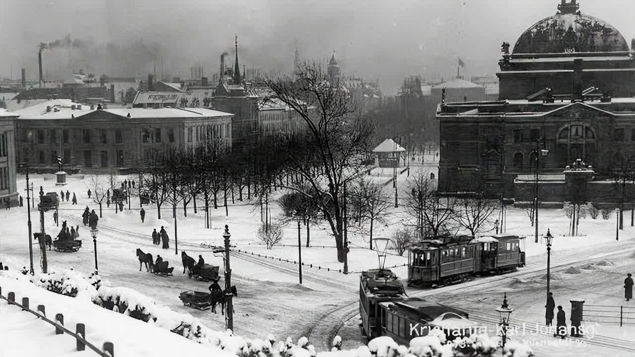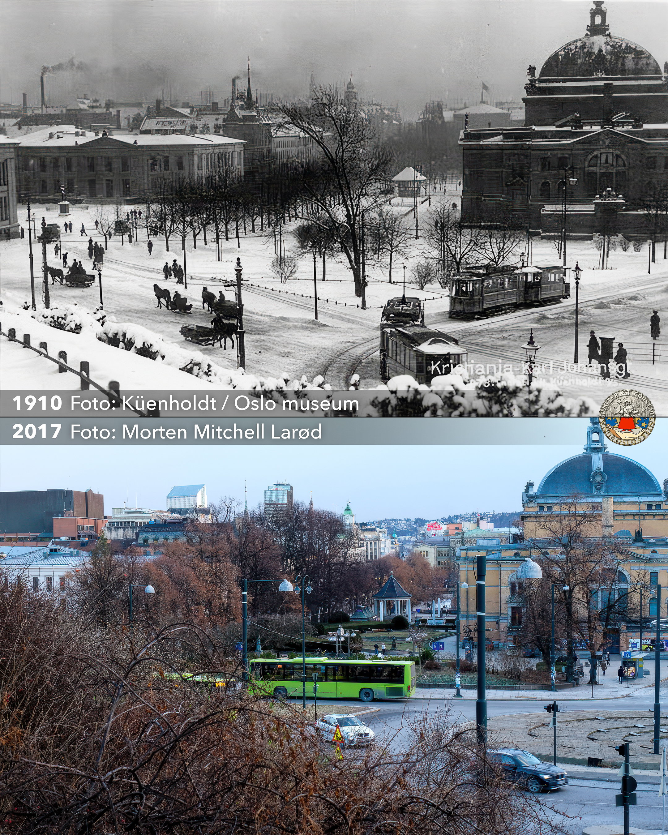 Dette var det første bildet jeg tok i mitt lille prosjekt, "Oslo før og nå". Bildet viser hvordan Oslo har forandret seg de siste 100 årene. Fra en tid med hest og slede, nyoppfinnelsen elektrikken, åpent og lavbygd, men forurenset, til mer tettgrodd, trfikkert og høyreist.